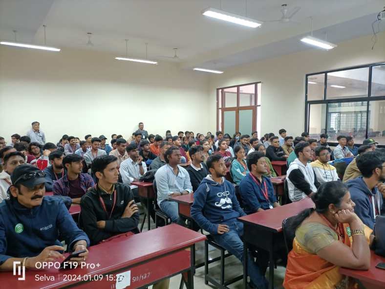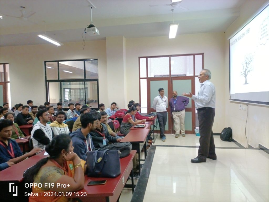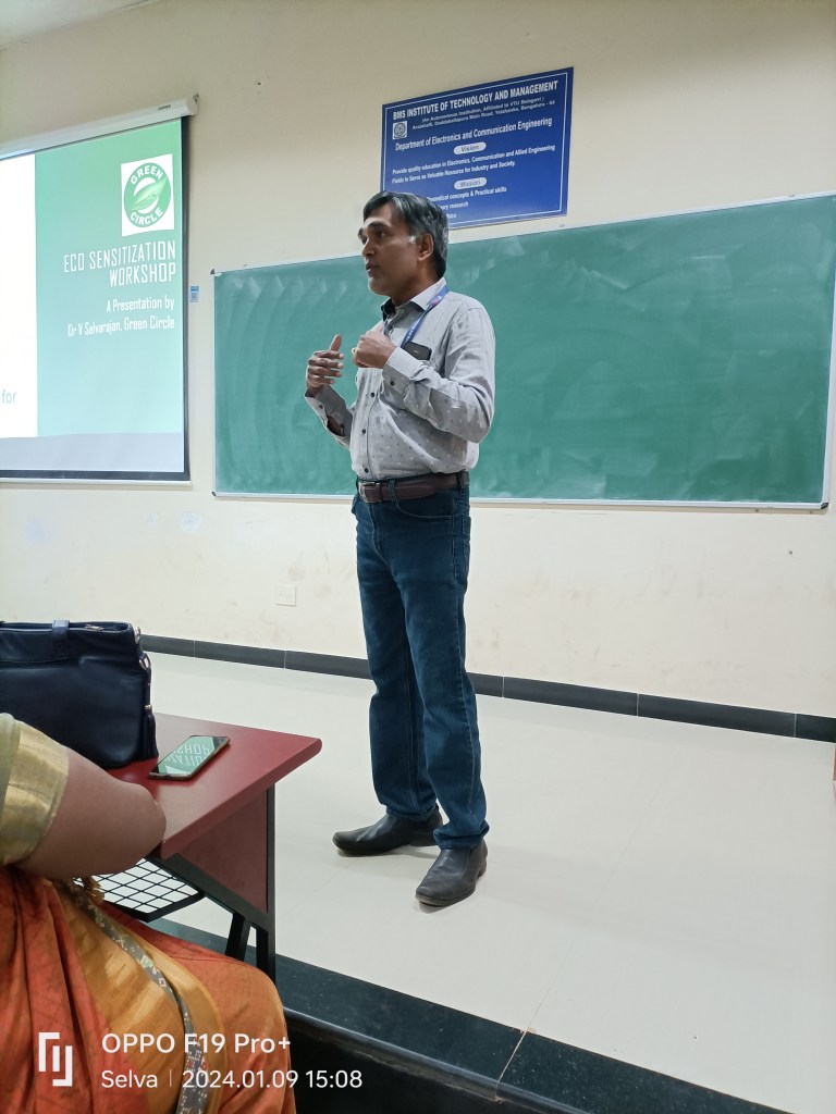 At BMS IT &M, an autonomous Institute of Technology and Management in Yelahanka, Bangalore, it is mandatory for students to plant a tree as part of the curriculum. With heavy burden of the academic syllabus, students found it difficult to spare time for the social activities. The professors also find it difficult to motivate the students to spare time for the environmental activities. Prof Jagadeesh of Mechanical Engineering found a solution when he was returning home after a hectic day of lectures. He came across the Green Circle plantation site and contacted the team. After understanding the situation, Green Circle offered a solution to conduct a eco sensitization workshop for students. The workshop was held on 9.1.2024. About 200 students and NSS volunteers participated in the workshop. Making a presentation, V.Selvarajan, Chairman, Green Circle highlighted the need to strike a balance between studies and social work. Discussing the simple ways of doing environmental activities, he requested the students to spare minimum hours in a month to involve in planting and nurturing trees. Other activities like plogging drives, nature walks, camping, birding and trekking activities were also explained. Earlier Prof Jagadeesh welcomed the gathering and emphasized the need for sparing sometime for environmental protection. Green Circle members, Vasantha Kumar, Rashmi Kulkarni and Kumar Kalyandurg also attended the workshop and interacted with students. Vote of thanks was proposed by Prof Tejaswini. Professors Praveen Kumar, Rajesh Gopinath and Praveen Kumar also participated in the workshop and guided the students.