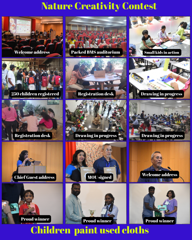 Green Circle, Bangalore is an environmental organisation working for nature conservation. It organised a Nature Creativity contest. The event was in association with Rotary Club of Bangalore Oasis, People’s trust, and BMS School of Architecture on 10.2.2024. The contest was attended by 250 children staring from 5 years to 21 years. The students were divided into three categories. Those up to 8 years made sketches on nature topics. Students between 9 and 14 years reused old cloths and fabrics. Senior students between 15 and 21 were doing waste to best models using the hidden talents of arts and crafts. The program was attended by about 300 people consisting of parents, college students, lecturers and school children. Welcoming the gathering, Dr. V Selvarajan Chairman of Green Circle said that children from 20 schools have participated in the contest besides 25 apartments. Dr Shaila. Bantanur, Director of the BMS School of Architecture was the Chief Guest of the Prize distribution ceremony. Distributing the awards and certificates, she lauded the efforts of Green Circle in imparting environmental awareness. She also announced that the School of Architecture has signed an MOU with Green Circle for undertaking joint programs in the BMS School of Architecture. She added that the students will be conducting environmental activities like plogging and tree planting activities besides nature trails. First prize was bagged by Sai Sashanth G(Sai Shankar Vidya Shala), Bhoomi B(Shiksha Sagar), Sharadha Vishwa Karma (Informatics National Public School) while the second place had gone to Ritvi Rahul C (Ryan International School), Saira (Airforce school), Thanmayi N Gowda(Vishwa Vidyapeeth) and the third prize has gone to Aarush Nambiar (Patel public school), Aadhya Avinash (Vibgyor school), Mourya (Informatics National Public School) in Group I, II and II respectively. Artists Prasad Natarajan, KA Srinivas and Anand were the Jurors. Harish Uthaiah, Director of People’s Trust felicitated the children for demonstrating their skills in creative works. Rtn. Paramaguru from Rotary club of Bangalore Oasis proposed the vote of thanks. Vasanthakumar, Kumar Kalyandurg, Namrata Seetharaman, Rtn Sriram and Supritha of BMS made the arrangements.