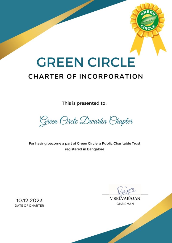 Green Circle Dwarka Chapter New Delhi was constituted on 10.12.2023. The Chapter was earlier the Head quarters of Green Circle, ever since beginning. At present the Dwarka Unit is certified as a Chapter of Green Circle Bangalore and will be functioning under its supervision and guidance. The Charter on the left side is issued by Green Circle Bangalore, a registered trust functioning from Yelahanka Bangalore.